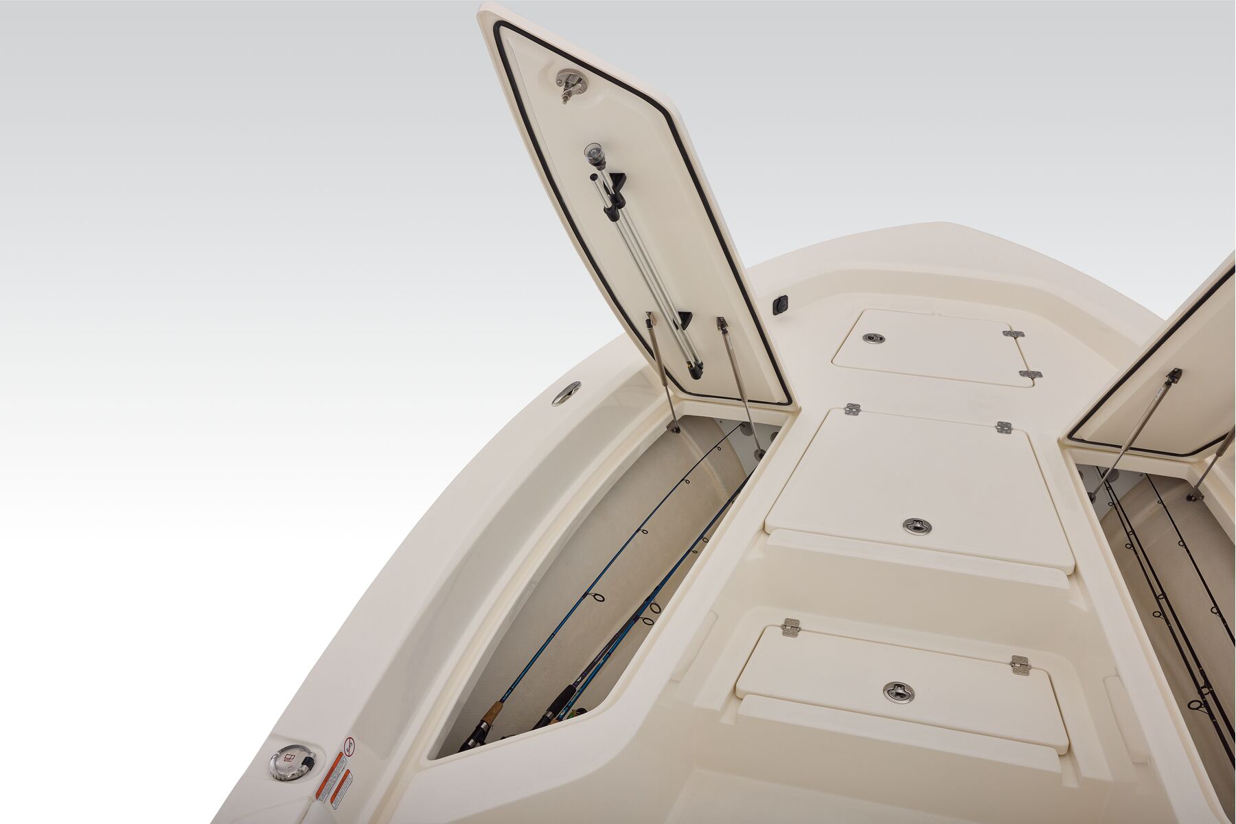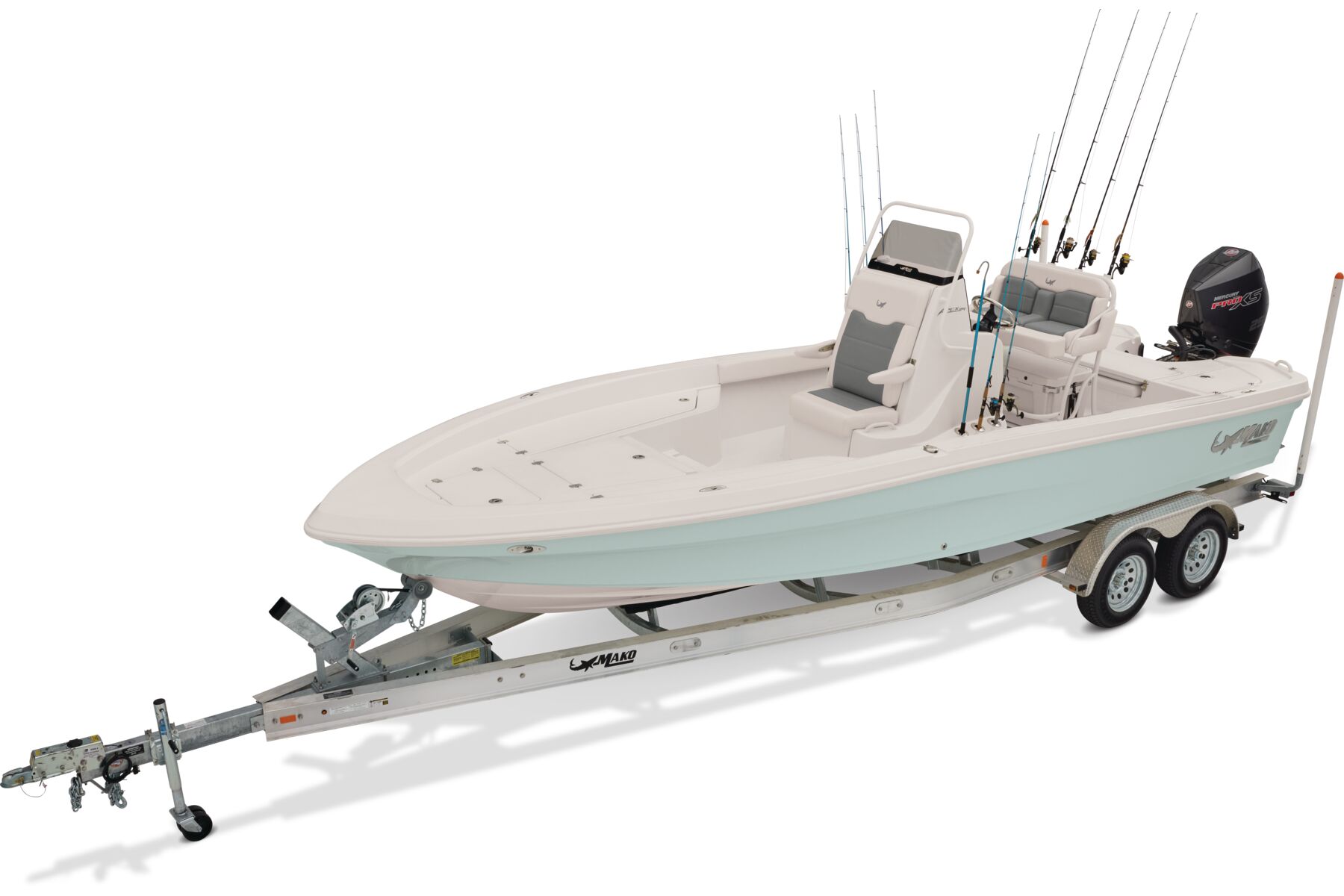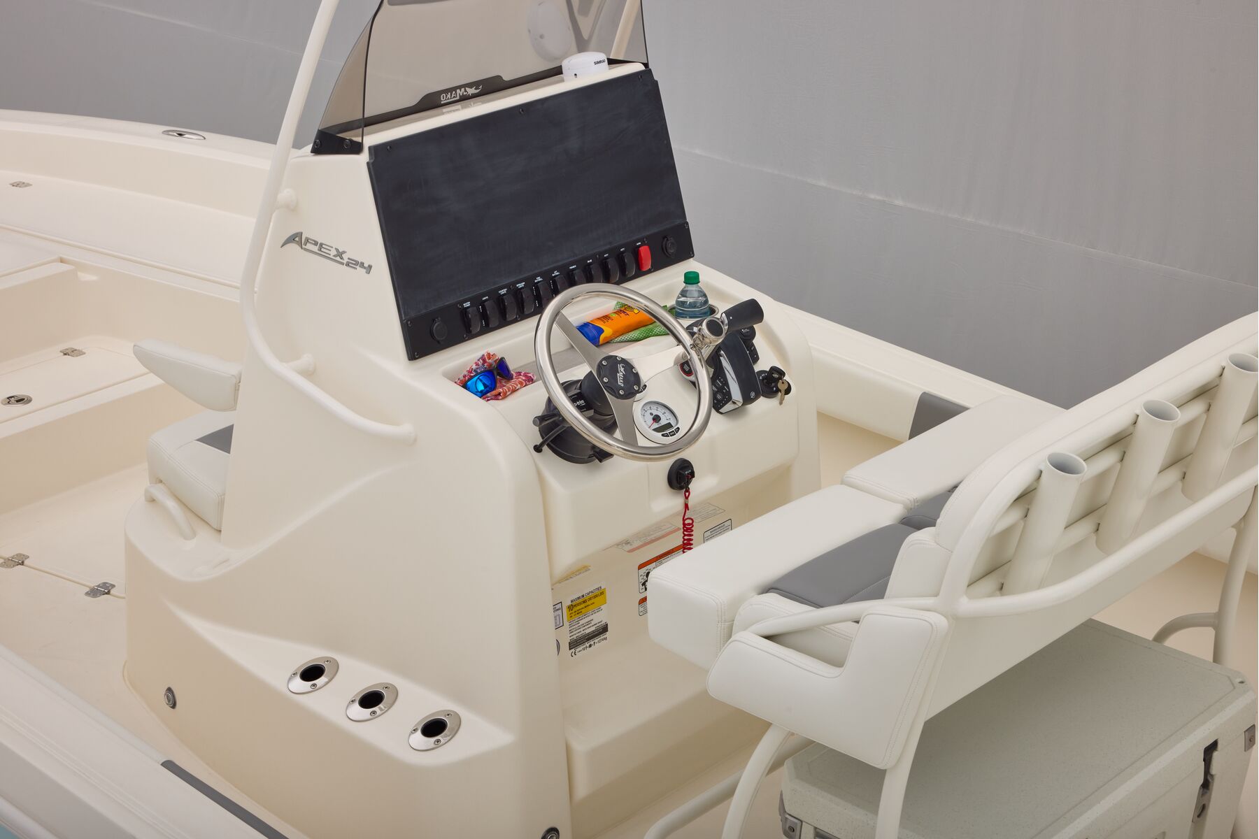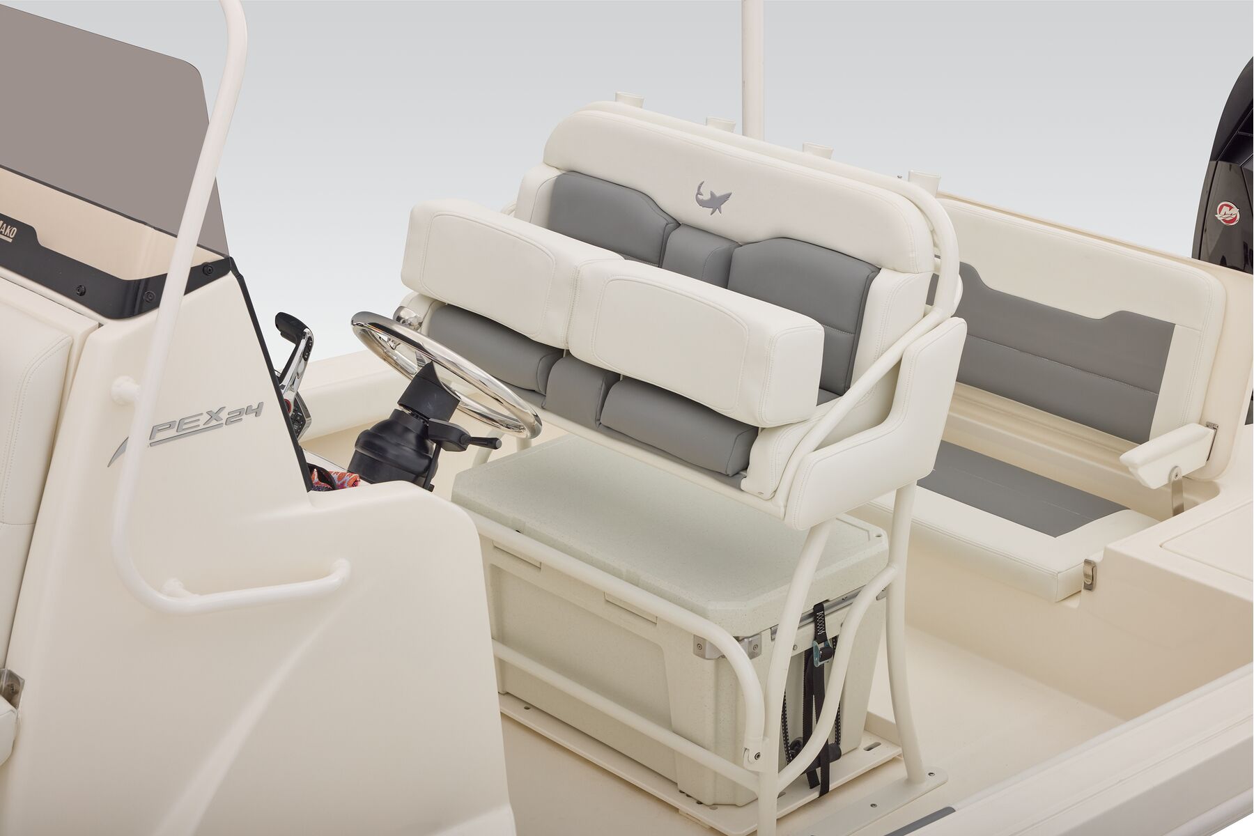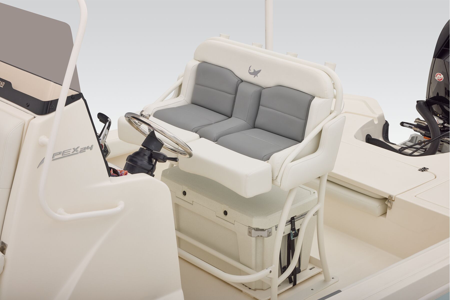 The MAKO® 24 Apex is here, slicing through waterways with a brand-new, performance-focused Next Generation Hull. Load up everything you need in its streamlined deck’s gear-organization solutions, including lockable gull-wing 8’ rod boxes, plenty of head storage, and more. Once you’ve found somewhere to cast a line, post up at the available fiberglass leaning-post bait station complete with a 30-gal. baitwell. The aft release well and bow in-step livewell round out this boat’s fishing-trip readiness. When it’s time to head back to shore to celebrate, hop in the central jump seat, engage the digital throttle, and get there faster with up to 400hp of get-up-and-go power. After experiencing the Apex, it's difficult to bring yourself back down.