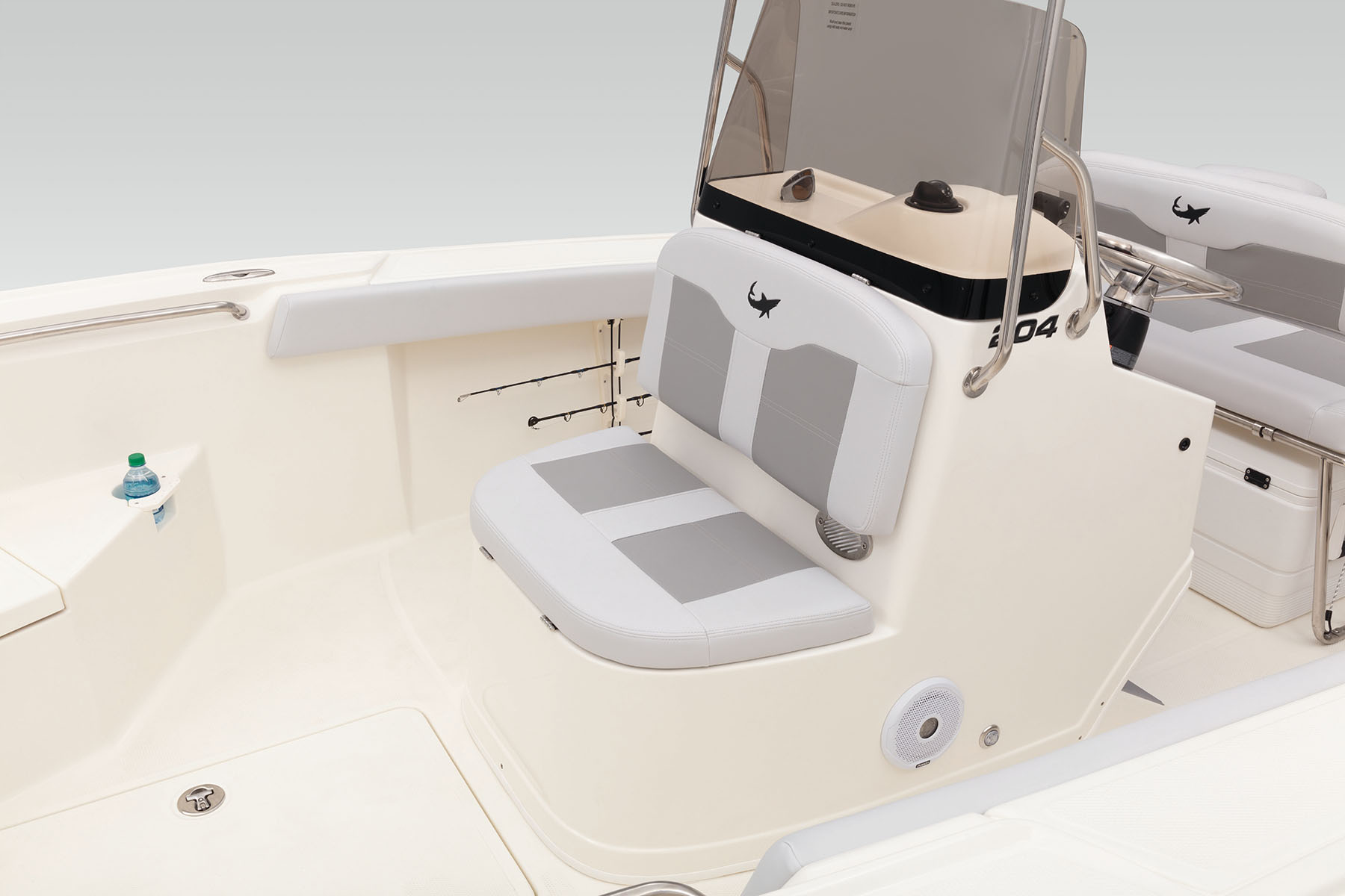 This superior offshore fishing craft features bow seating at port and starboard with storage beneath, a forward-console cushioned seat with a 21-gallon baitwell beneath and a swim platform—making it welcoming for both anglers and families.