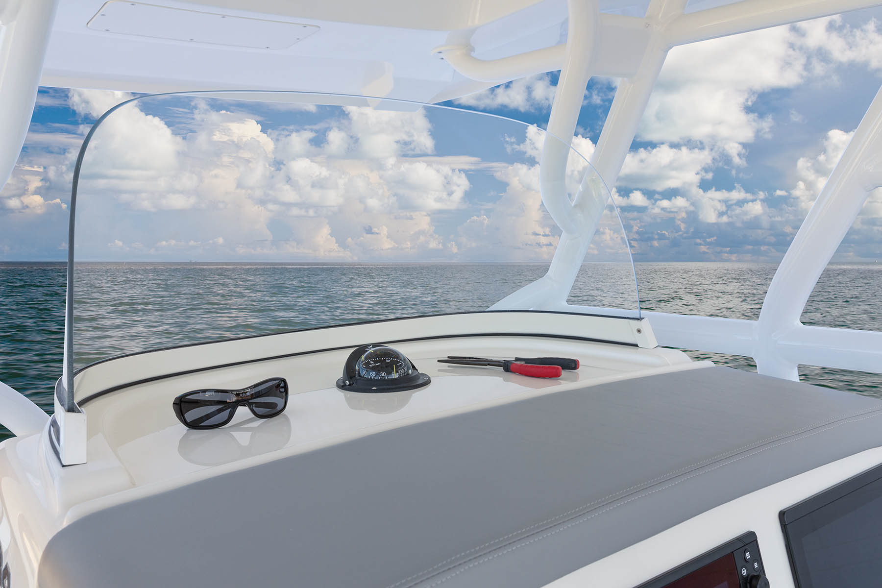 Family Edition: Loaded with creature comforts for the discerning family, the MAKO 334 CC Family Edition includes luxurious bow seating with folding back rests and gel-coated storage beneath. A removable, cushioned bow filler converts to a raised table for entertaining, and stows away when not in use. And at the back of the hardtop, there’s a 5’ auto-retractable sun shade that can be controlled from the helm or from a mobile device using the Sharktooth™ app.
